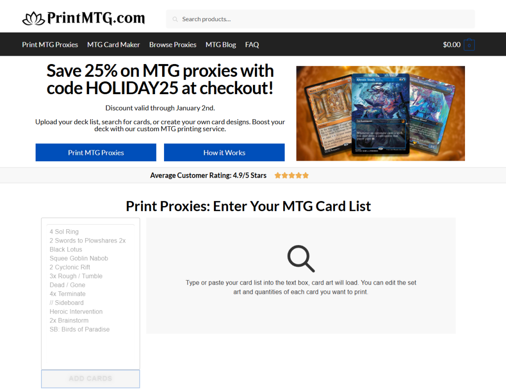 With PrintMTG, you can paste in an entire deck list, review it, choose which art or set versions you want, and place the order. It is designed around the exact thing MTG players do every week.
